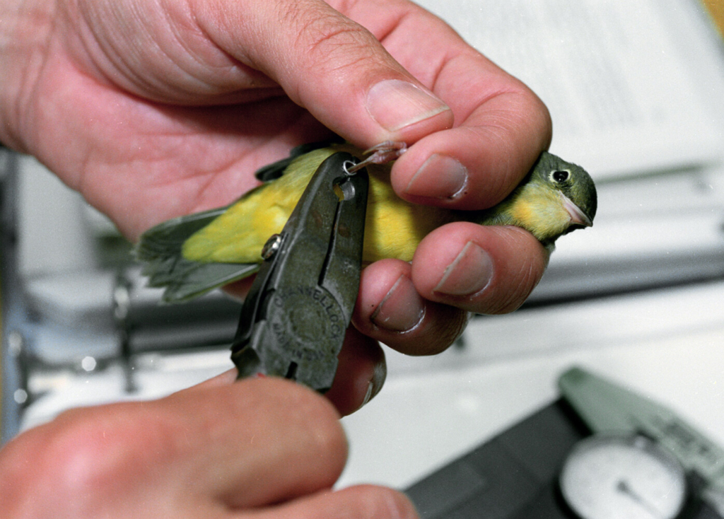 A mourning warbler rests as a researcher gently clips an identification band around its leg. Jack Milton/Staff Photographer