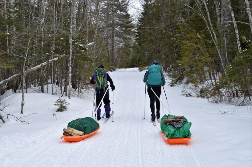 Carey Kish and his Nordic skiing companion, Willow Sherwood, tow their ski pulks through Katahdin Woods and Waters National Monument last winter. Photo courtesy of Carey Kish