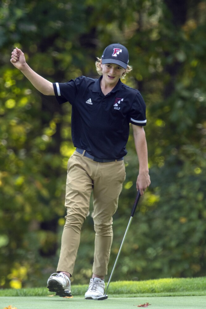 Freeport’s Eli Spaulding celebrates after sinking a putt during the Class B state championships on Oct. 8 at Natanis Golf Club in Vassalboro. Spaulding shot 4-under 68 to win the boys individual title. Joe Phelan/Kennebec Journal