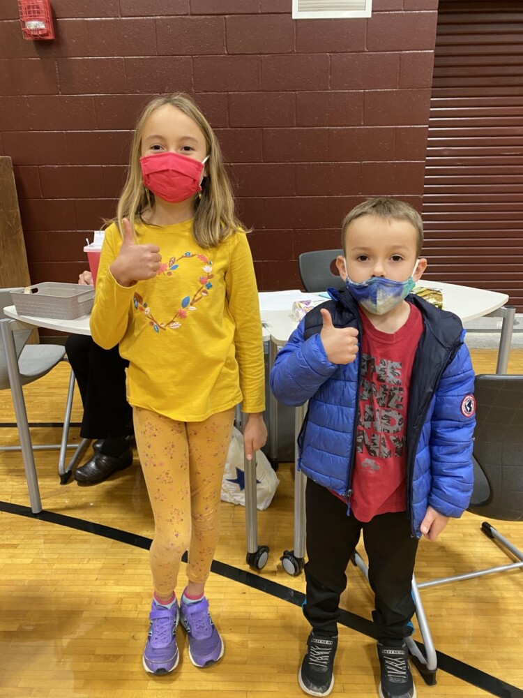 Fourth grader Grace Ryerson and kindergartner Luke Ryerson give a thumbs up last week after receiving COVID-15 vaccines at an SAD 51 clinic. Contributed / SAD 51