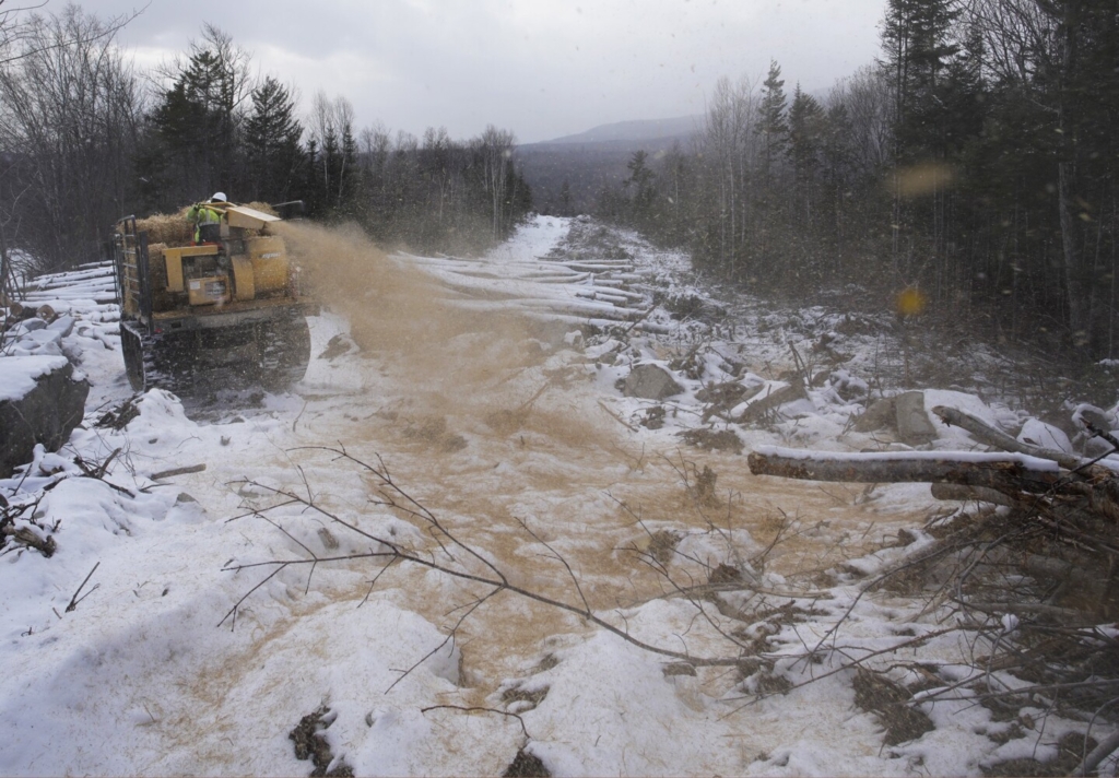 The machine moved methodically, its boom swinging back and forth, scooping the tree grindings into the 22-cubic-yard bed of a yellow off-road dump truck on Tuesday. From there, the giant hauler lumbered down a steep hill and dropped the grindings. Soon, the fibrous heaps would be spread along the rocky, root-covered dirt floor of a 54-foot-wide corridor that slices through hardwood forest toward the mountainous horizon.