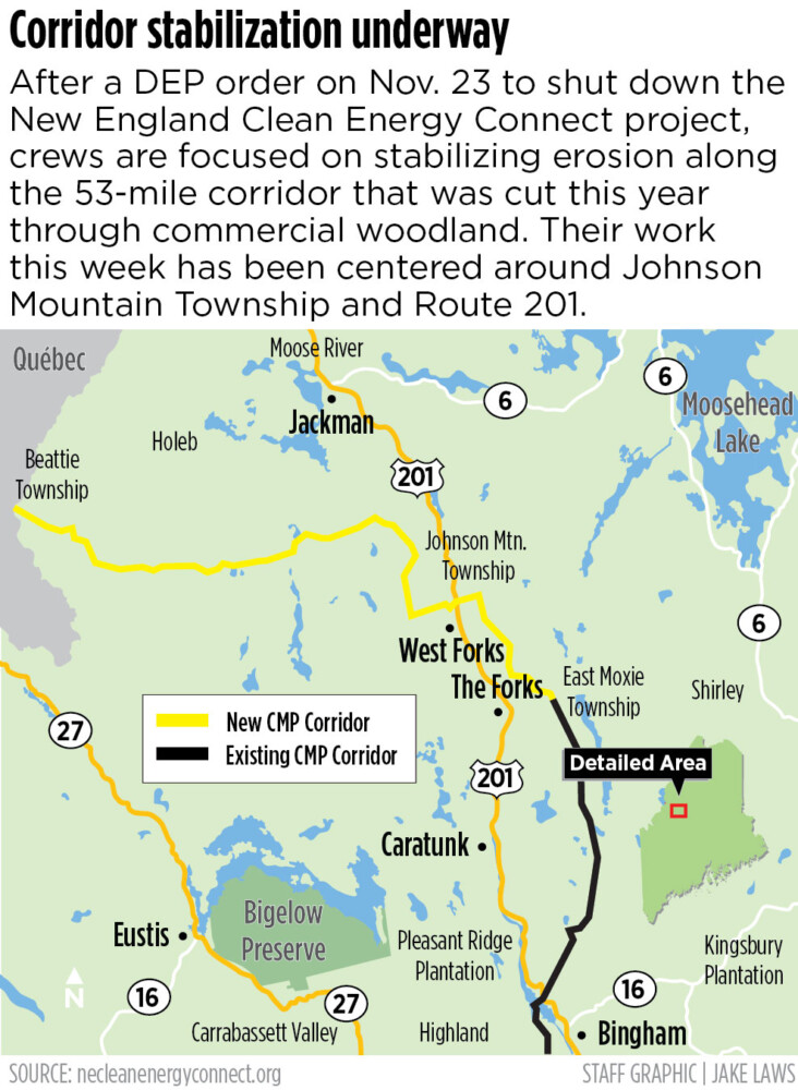 No one knows the future of the the New England Clean Energy Connect, Maine’s most controversial energy project in a generation. But one thing is clear: By order of the Maine Department of Environmental Protection, NECEC Transmission LLC has 30 days – starting from Nov. 23 – to stabilize the 145-mile corridor within specifications set by the agency. An overriding goal is to minimize soil erosion that could be triggered by rain or runoff and carry sediment into wetlands and streams.