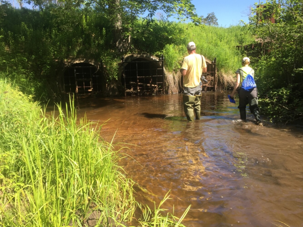 Brook assessors John Field and Kristin Feindel observe a brook emerging from the culverts that take it under the runway at Brunswick Executive Airport. Contributed photo
