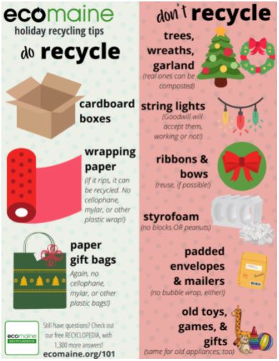 Keep recycling during the holiday season, but ecomaine, the Portland-based recycling facility, is making a list and checking it twice – a list of acceptable items in single-sort recycling bins this holiday season.