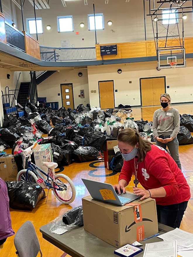 Volunteers, along with police and fire personnel, assisted at the community center that afternoon when the families were scheduled to pick up their gifts.