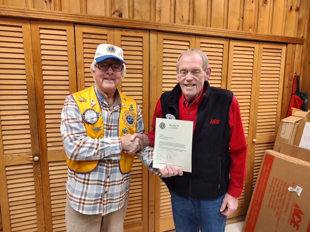 Gorham Lions Club President Ken Aldrich presents a proclamation to Jim Rines, manager of Plummer’s Hardware, to thank the store for allowing the Lions to sell Christmas trees from the parking lot. “Gorham Lions had their most successful tree sale yet, and will have enough revenue to fund five Gorham High School scholarships for college-bound students,” Aldrich said in a press release. Contributed / Gorham Lions