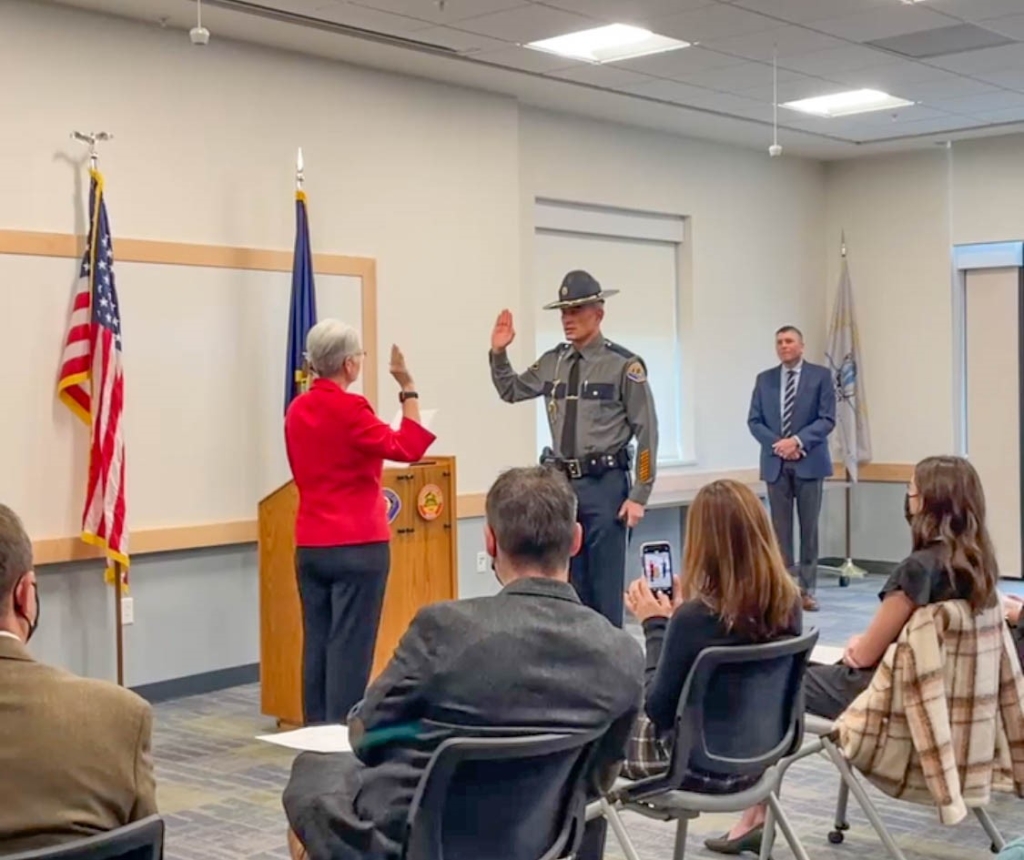 After a several month search that began this summer, newly appointed Chief Mark Holmquist was sworn in on Monday Dec. 6 at a ceremony attended by his family, town officials, police officers, fire staff, former coworkers from the Maine State Police and Moulton.