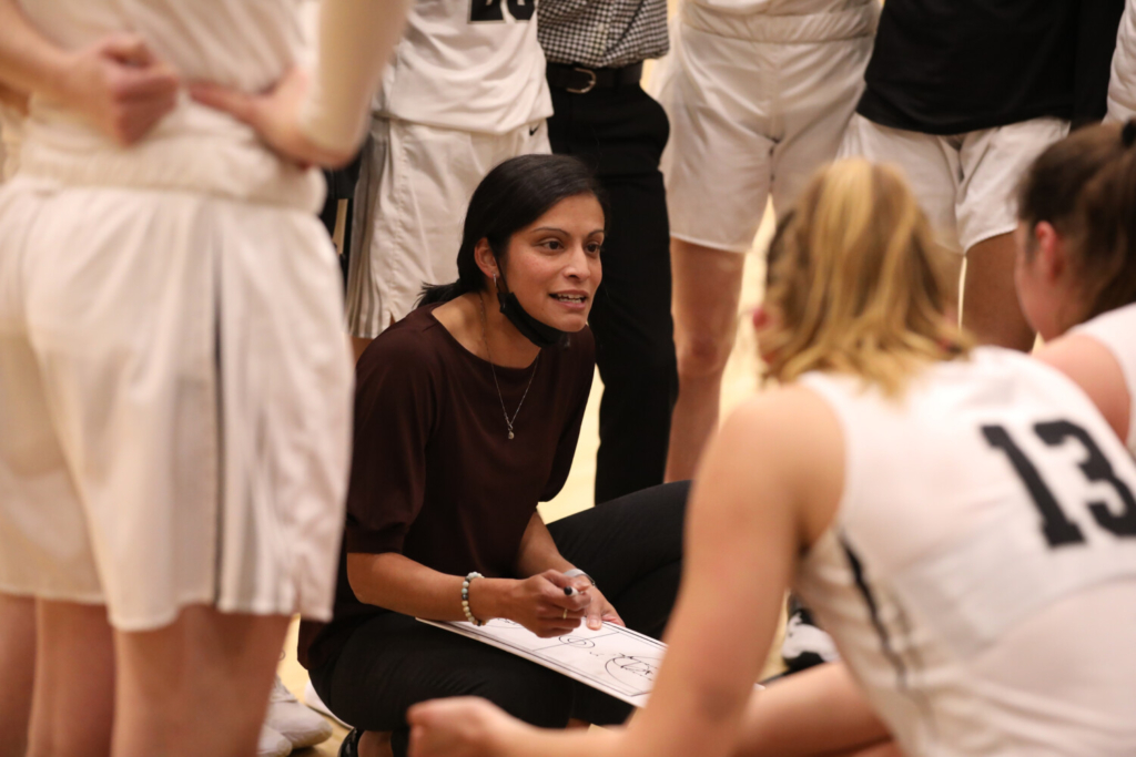 Bowdoin women’s basketball coach Sacha Santimano draws up a play during a timeout in a game against the University of Southern Maine. Contributed / Bowdoin Athletics