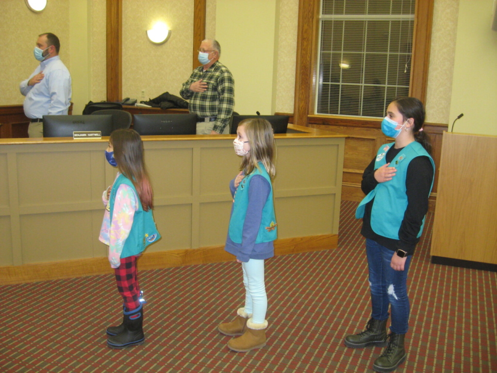 From left, Troop 1027 Junior Girl Scouts Michelle Shaw, Ava Carr and Maci Pratt lead the Pledge of Allegiance at the Jan. 4 Town Council meeting. Also shown are Councilors Ben Hartwell and Ron Shepard. Robert Lowell / American Journal