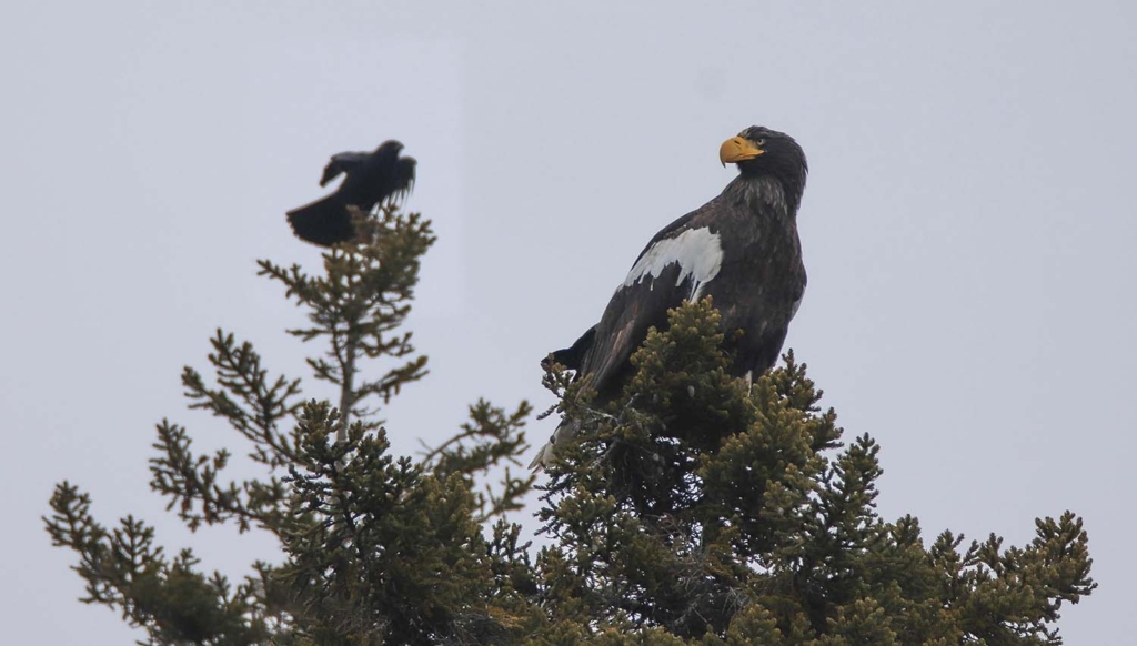 In this Dec. 31, 2021 photo provided by Zachary Holderby, a Steller’s sea eagle is seen off Georgetown, Maine near a crow. Zachary Holderby, Downeast Audubon via AP