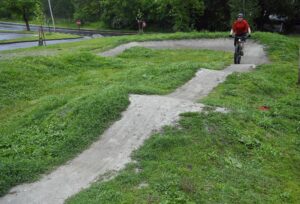 A pump track is a short, looping course with bumps and turns that mountain bikers traverse by pumping their bike with their upper body rather than pedaling.