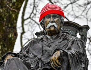 On Sunday, Fuller emailed a photograph of the statue, depicting the seated jurist in the bed of a pickup truck, to Spectrum News, with a note reading, “Maybe the chief justice has gone South for the winter!”