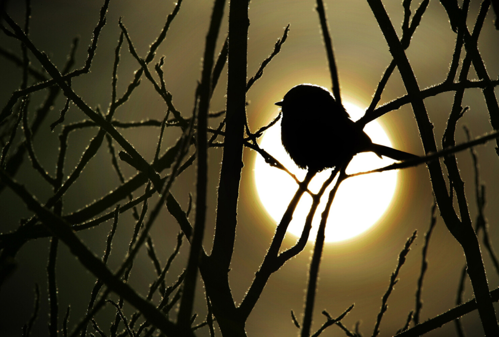 A chickadee rests on an ice-coated branch at sunrise with the temperature at 13 degrees below zero in Westfield in 2007. A chickadee may burn 40% of its body weight in a single frigid night. Its job in the morning is to find food to replace the fat that was burned. Robert F. Bukaty/Associated Press