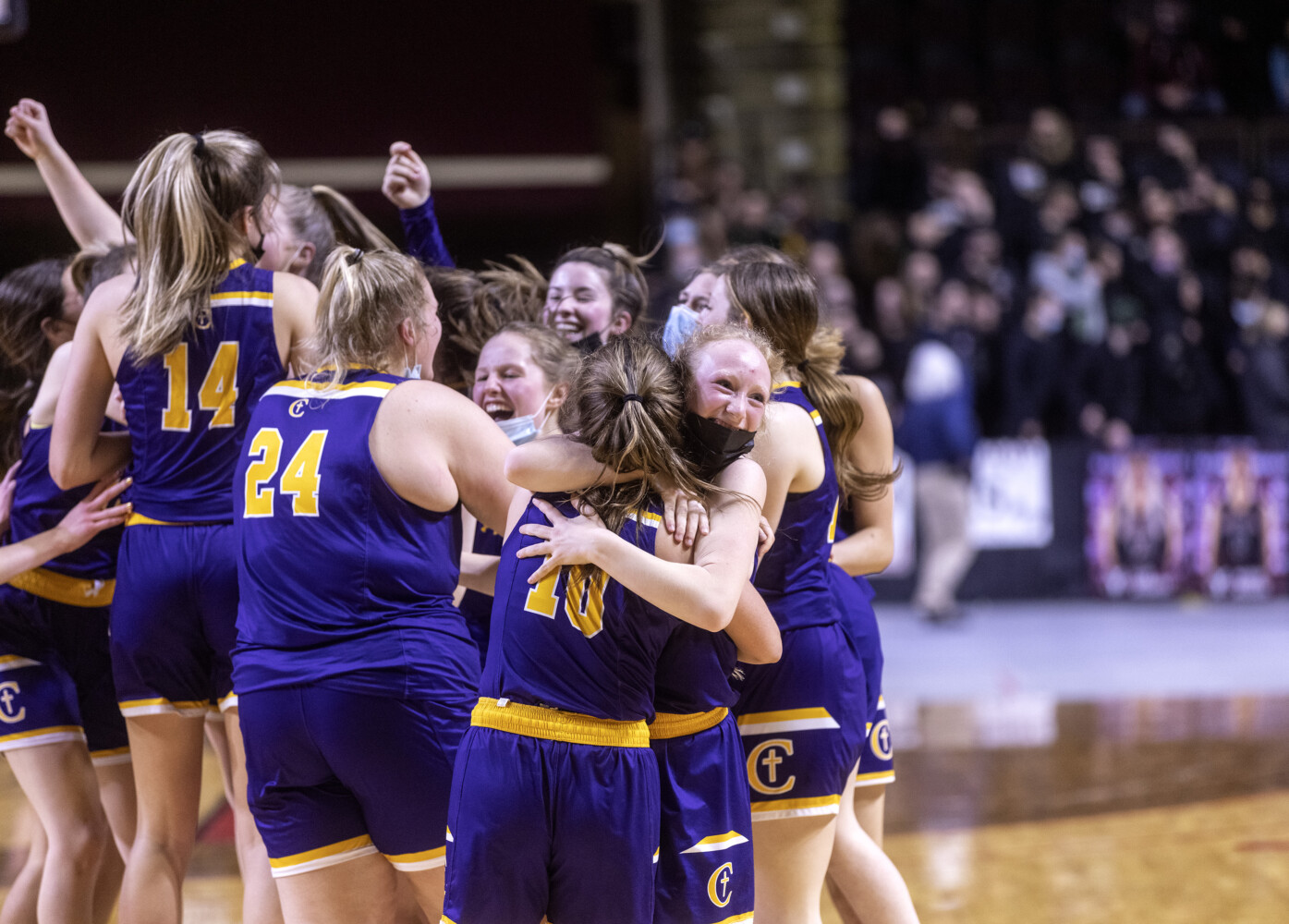 Cheverus celebrates moments after a 49-36 win over Gorham in the Class AA girls’ basketball state championship game. Brianna Soukup/Staff Photographer