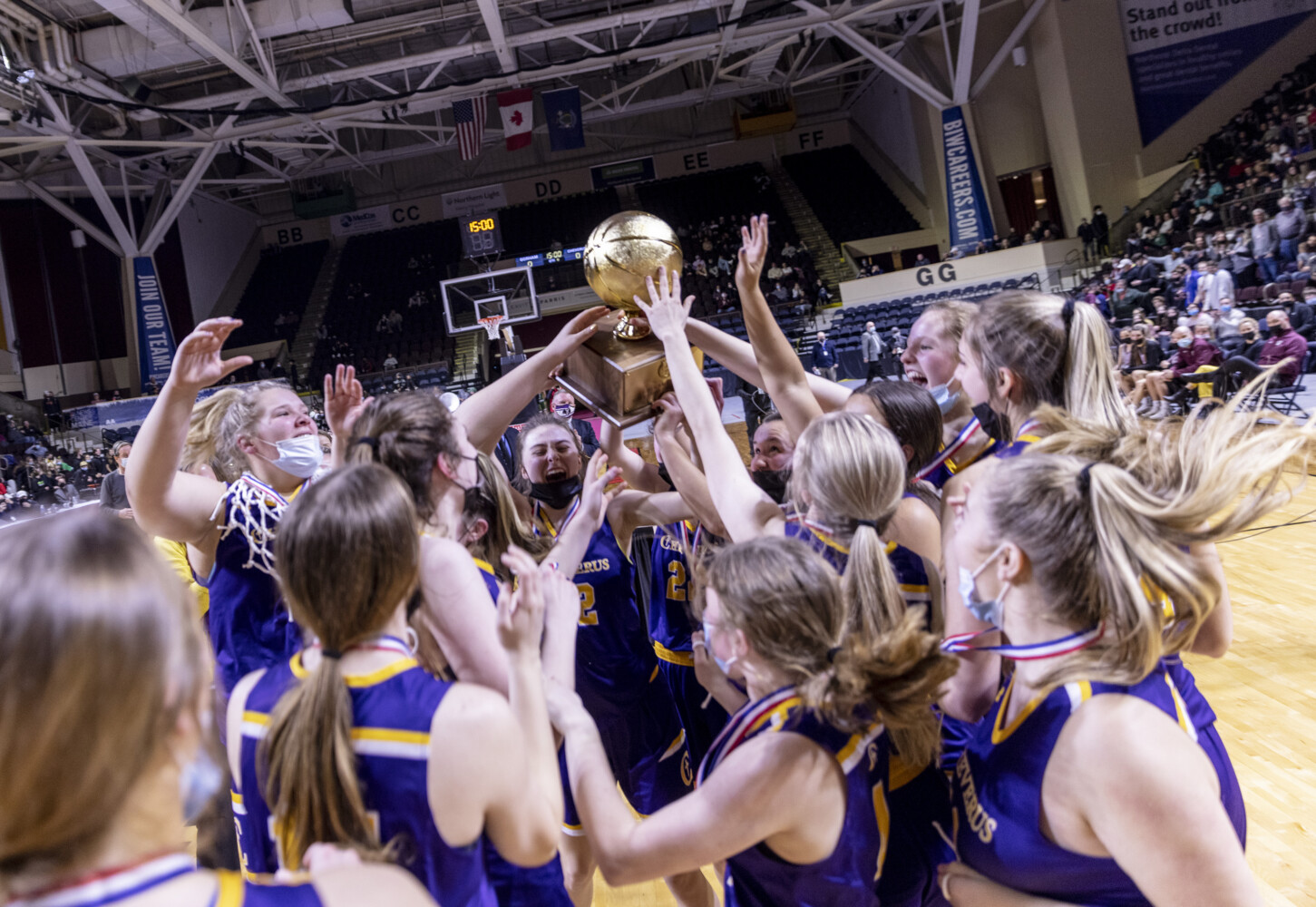 Hall-Dale holds the gold ball after beating Stearns in the Class C girls basketball state championship game Saturday at the Augusta Civic Center. Joe Phelan/Kennebec Journal