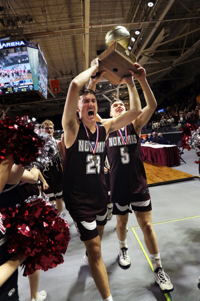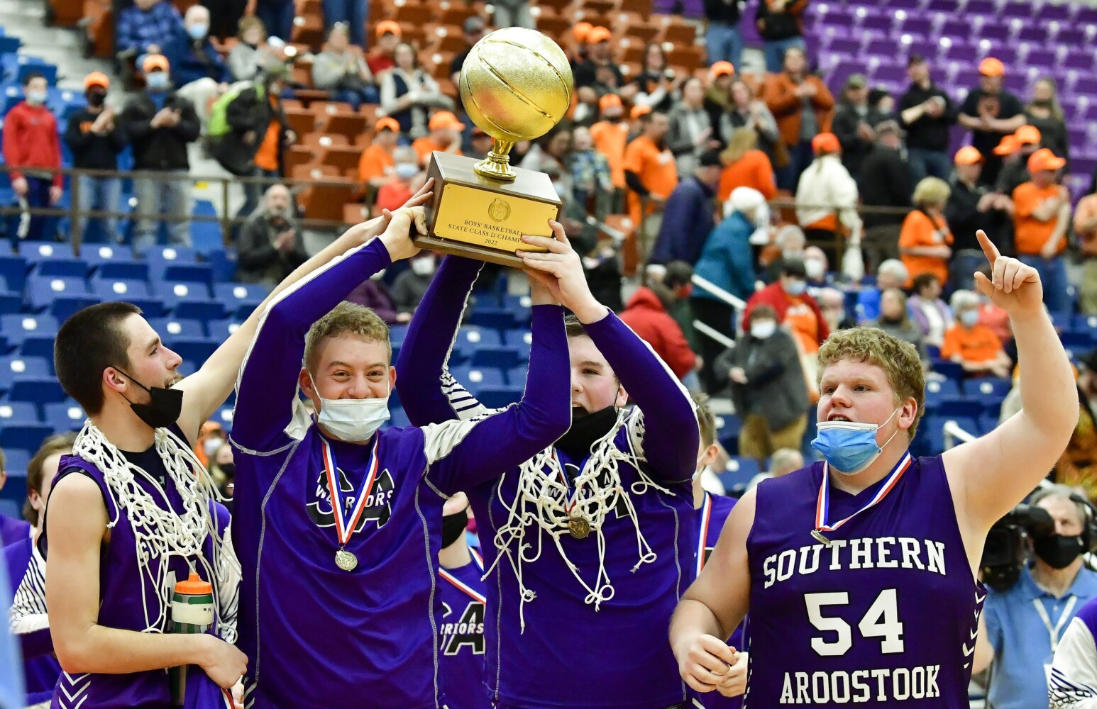 Southern Aroostook players hold up the gold ball after beating Forest Hills in the Class D boys basketball state championship game Saturday at the Augusta Civic Center. Joe Phelan/Kennebec Journal