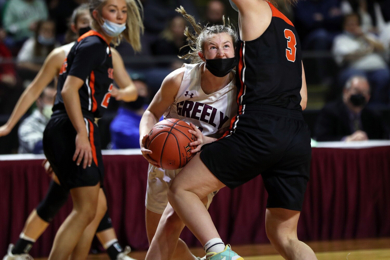 Greely’s Chelsea Graiver collides with Skowhegan’s Jaycie Christopher during the Class A state championship on Saturday at Cross Insurance Arena. Ben McCanna/Staff Photographer