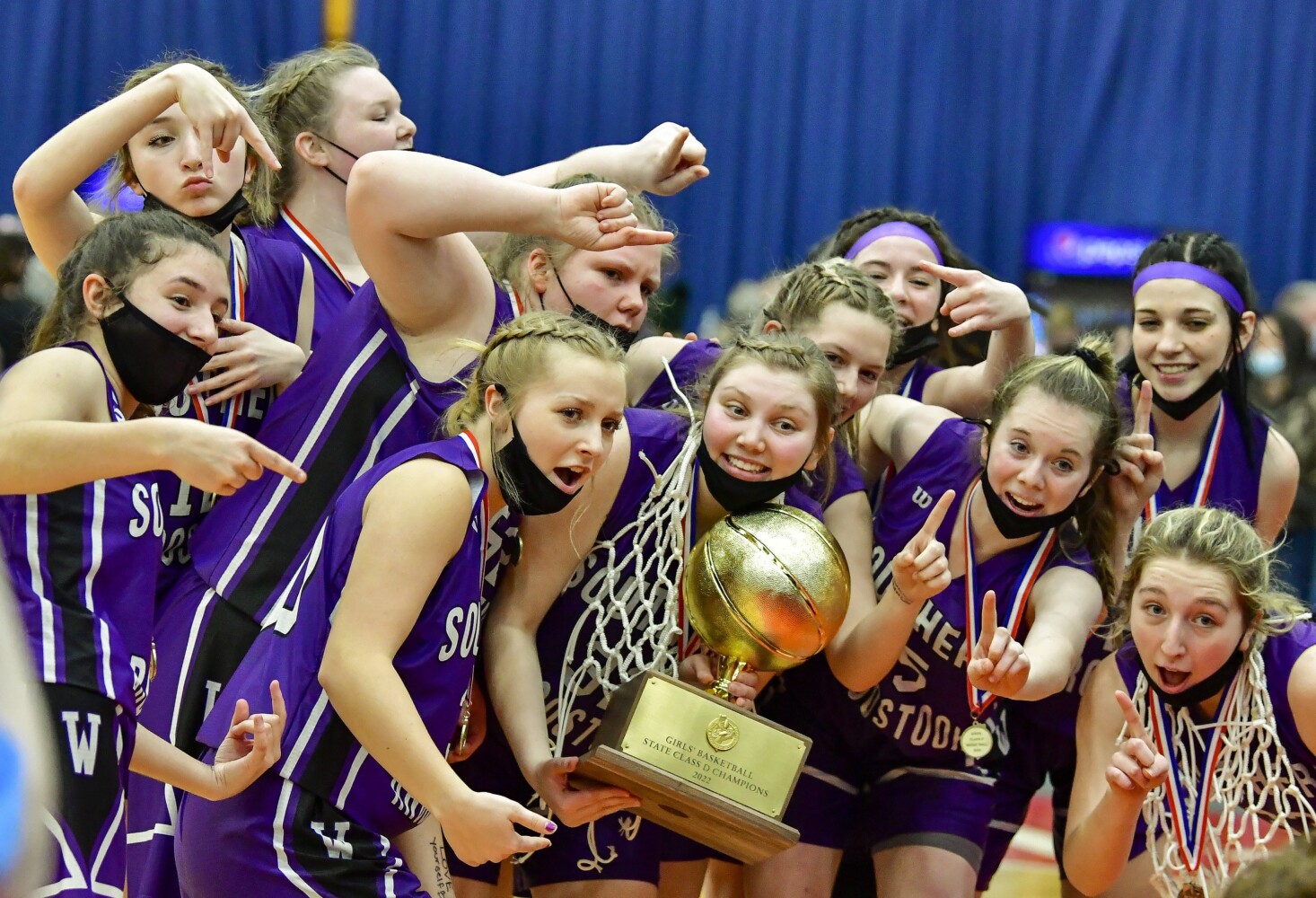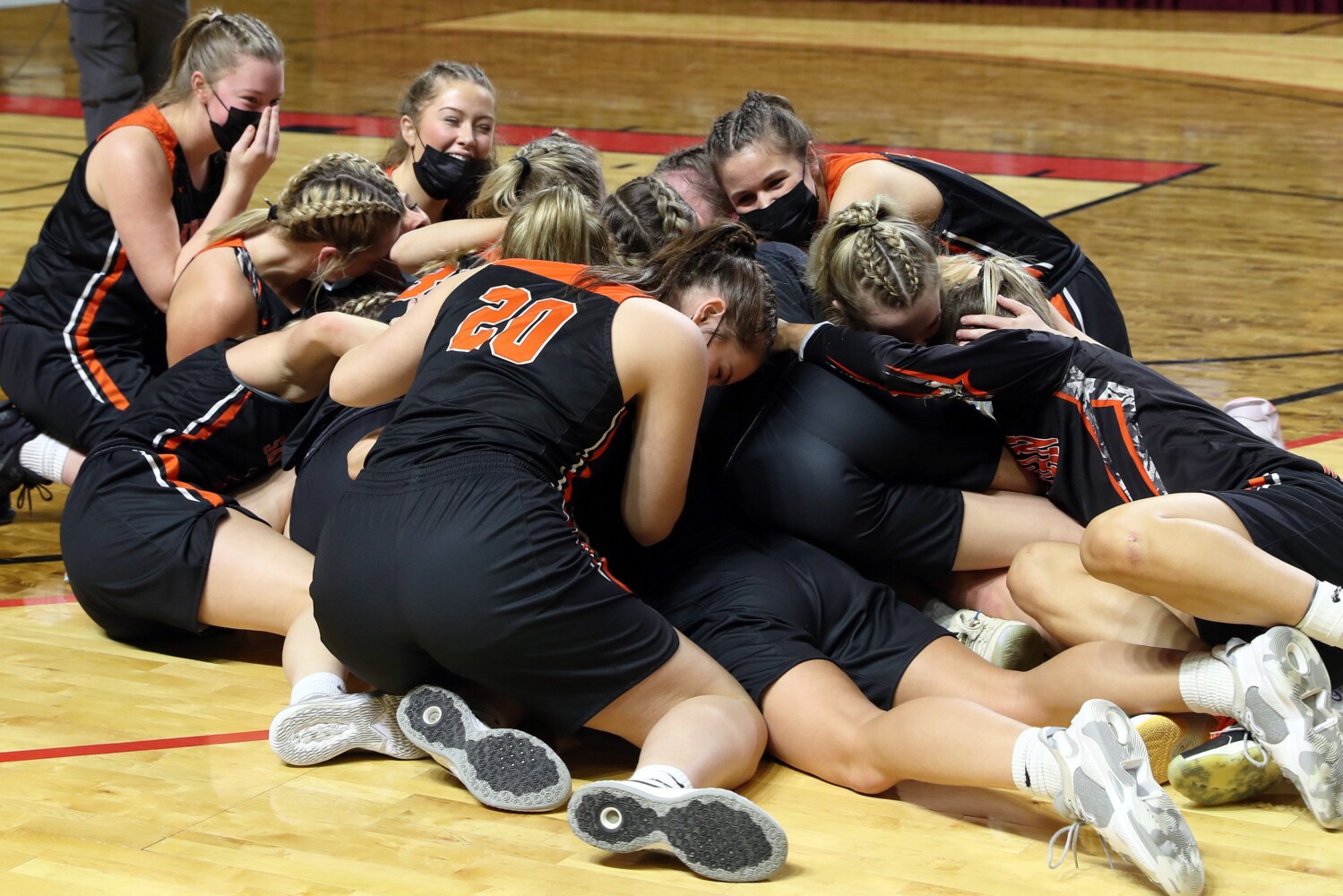 Southern Aroostook players celebrate after beating Seacoast Christian to win the Class D girls basketball state championship Saturday at the Augusta Civic Center. Joe Phelan/Kennebec Journal