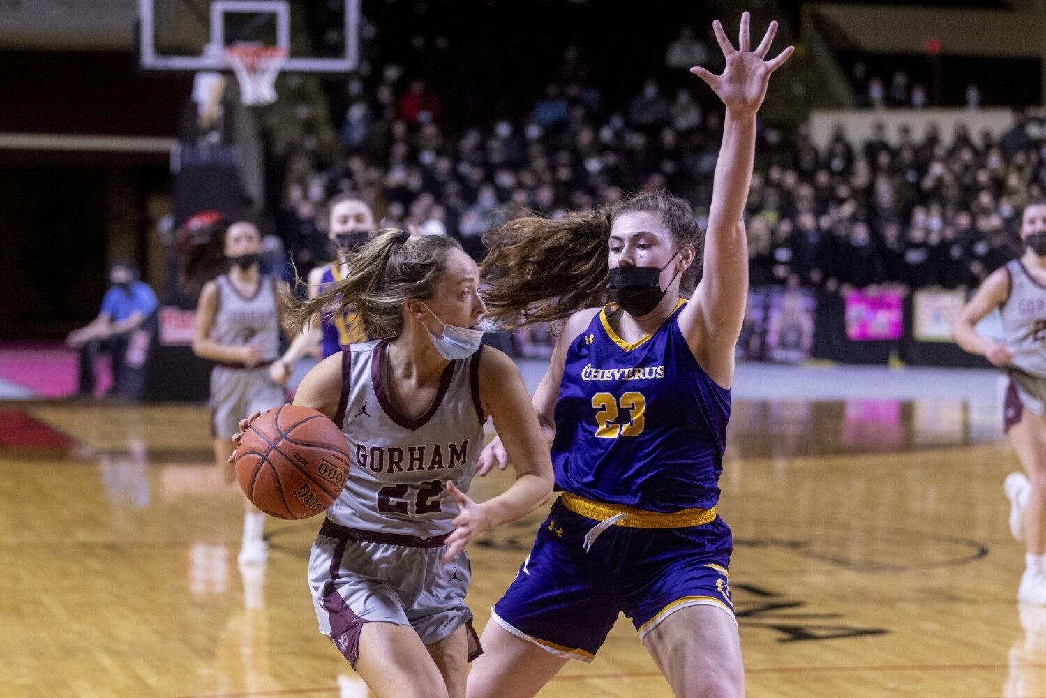 Cheverus’ Maddie Fitzpatrick guards Gorham’s Anna Nelson as she makes her way toward the hoop. Brianna Soukup/Staff Photographer