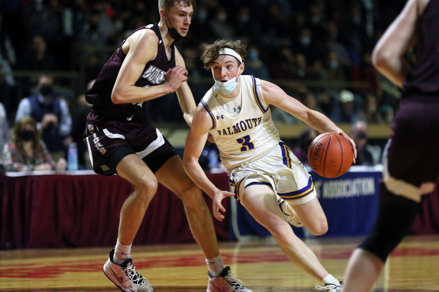 Falmouth’s Jack Stowell outmaneuvers Nokomis’ Cooper Flagg during the Class A state championship. Ben McCanna/Staff Photographer