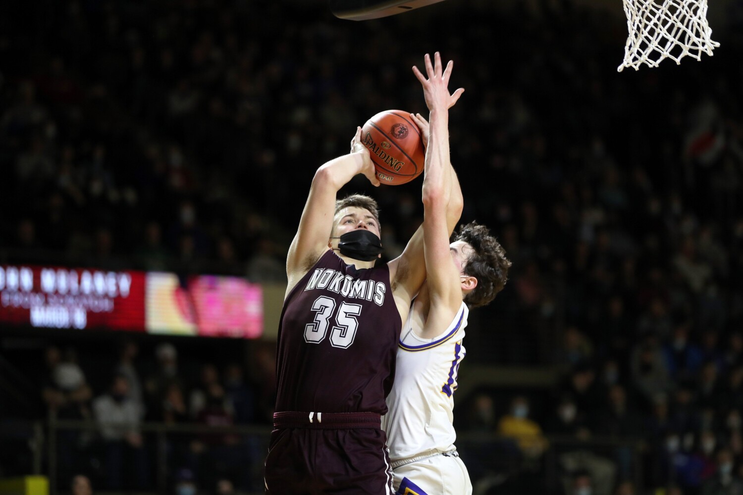 Nokomis’ Cooper Flagg maneuvers around Falmouth’s Zach Morrill during the Class A state championship game. Ben McCanna/Staff Photographer