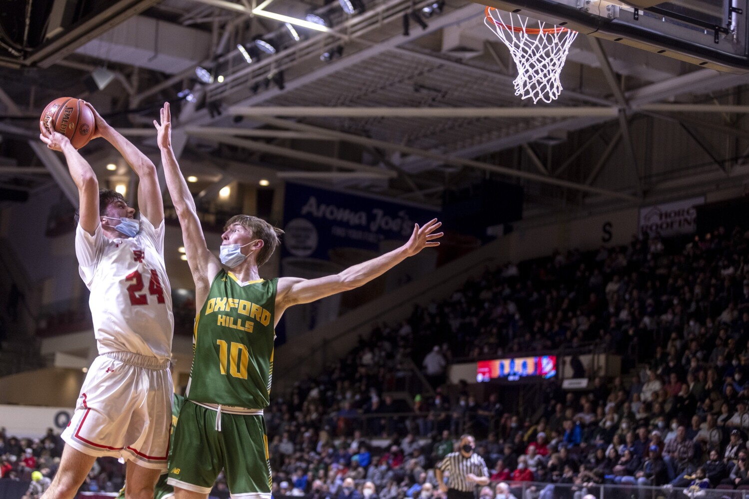 South Portland’s Owen Maloney takes a shot while being guarded by Oxford Hills’ Teigan Pelletier. Brianna Soukup/Staff Photographer