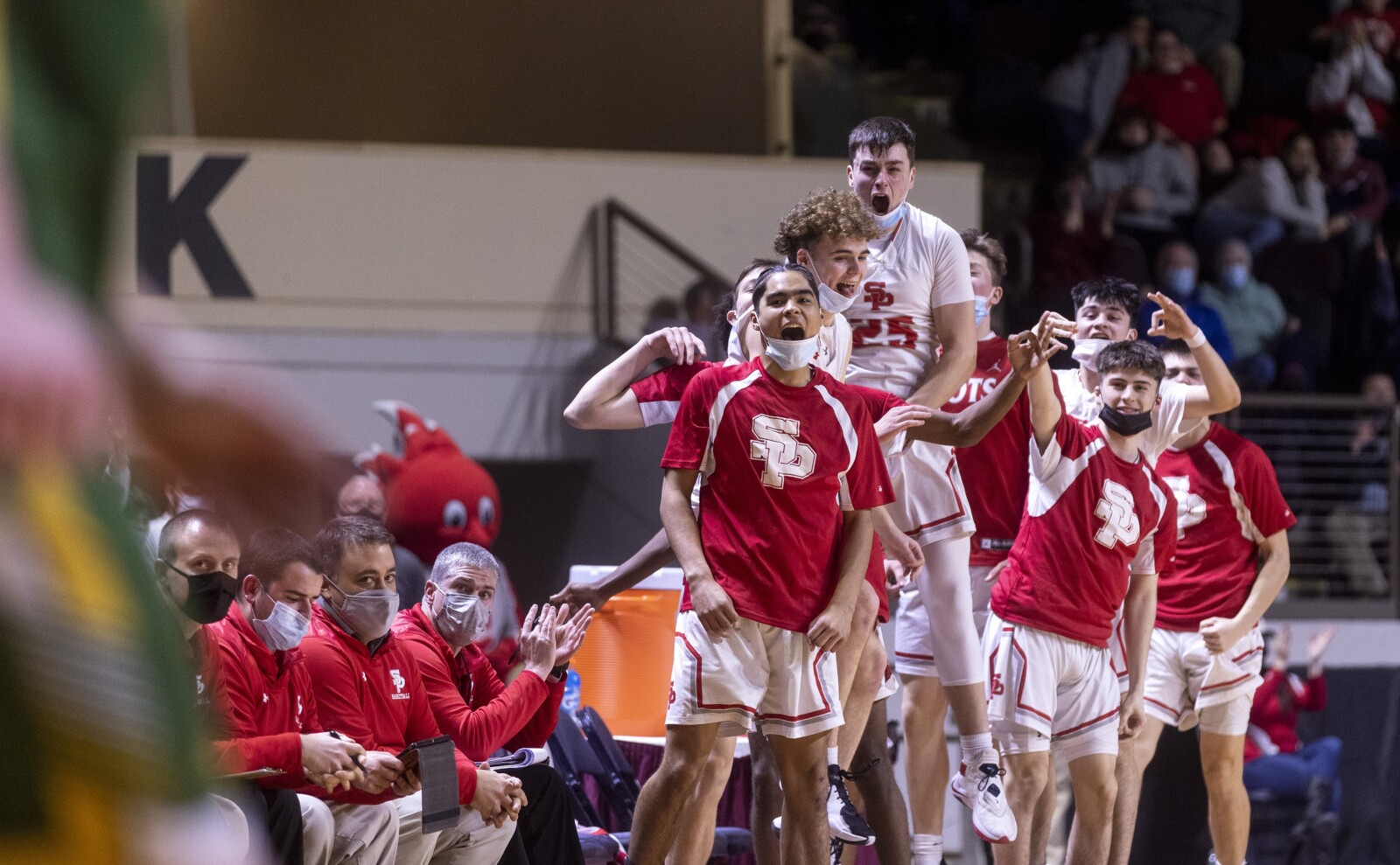 Cheverus players celebrate a 3-point shot by their teammate Julia Kratzer. Brianna Soukup/Staff Photographer