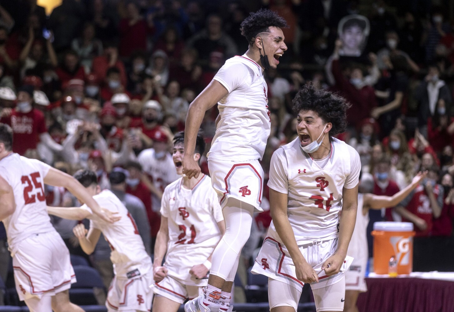 South Portland players celebrate a basket against Oxford Hills during the Class AA boys’ basketball state championship game on Saturday at Cross Insurance Arena in Portland. Brianna Soukup/Staff Photographer