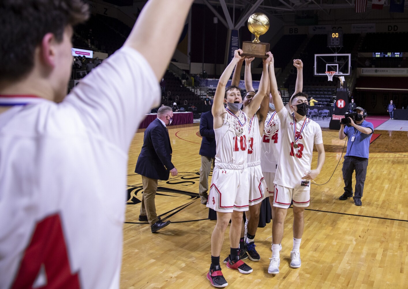 South Portland boys basketball team celebrate with their trophy after beating Oxford Hills in the Class AA state championship game on Saturday. Brianna Soukup/Staff Photographer
