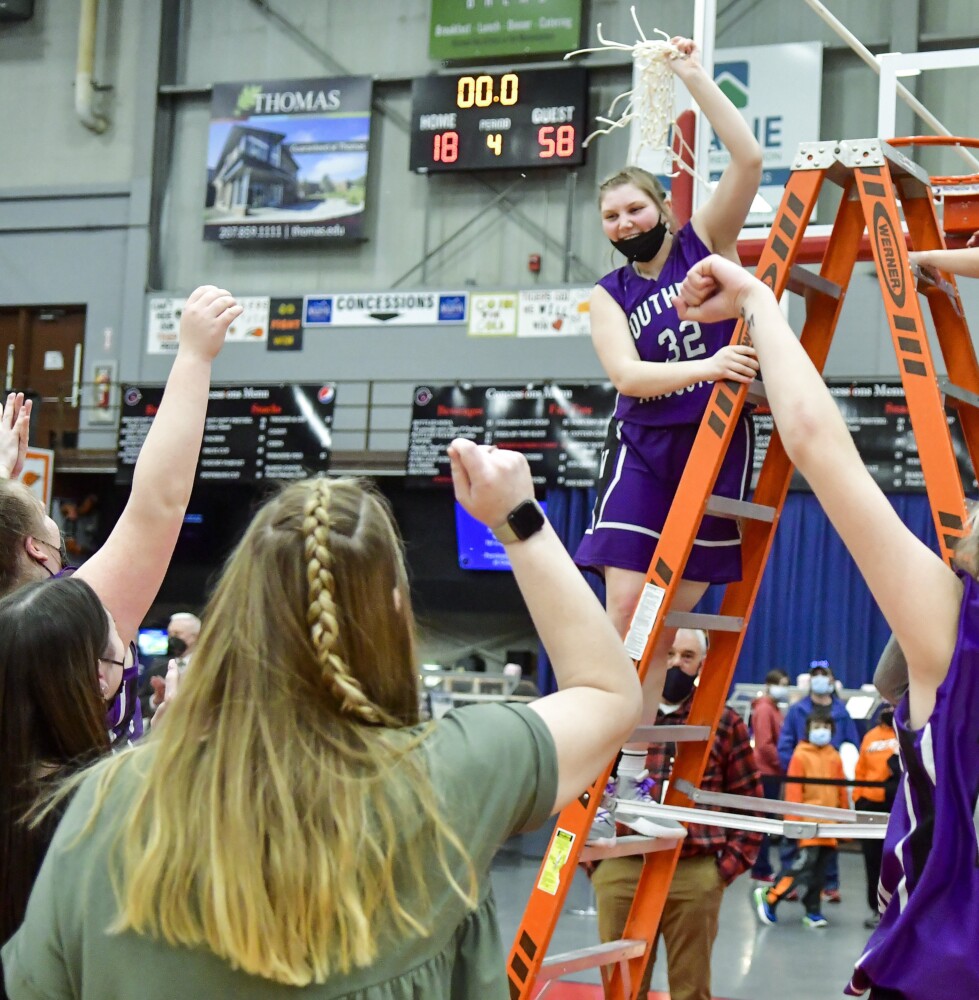 Southern Aroostook’s Brianne Daggett waves the net and celebrates after the team beat Seacoast Christina for the Class D girls basketball state championship Saturday at the Augusta Civic Center. Joe Phelan/Kennebec Journal