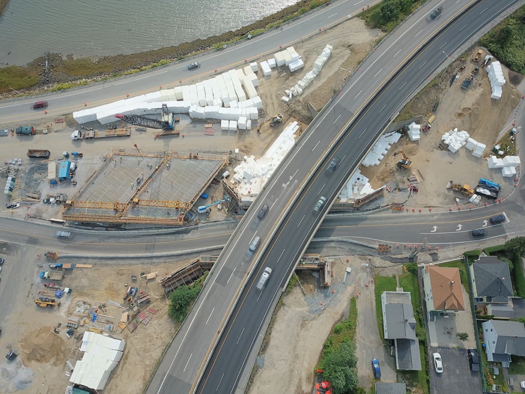 This photo of the Veranda Street bridge shows the white geofoam blocks that will be used to support the foundation of the new structure. To the left of I-295 is the deck of the new bridge, which will be rolled into place once the old bridge is demolished and removed. Photo courtesy of Maine Department of Transportation
