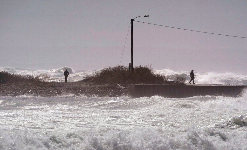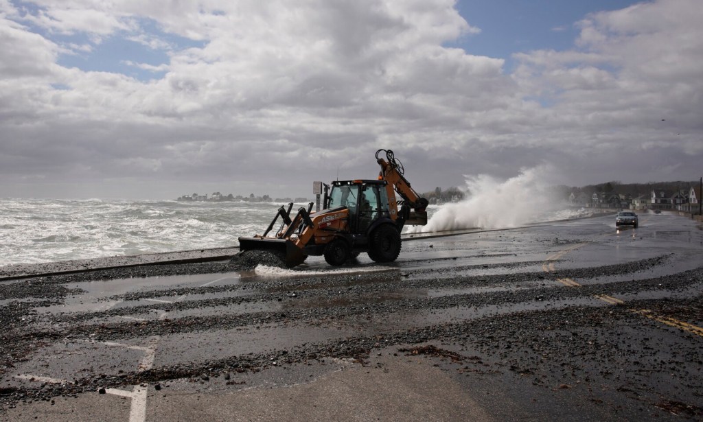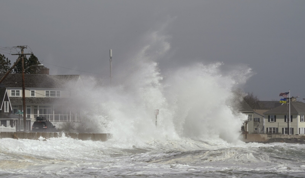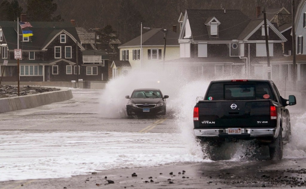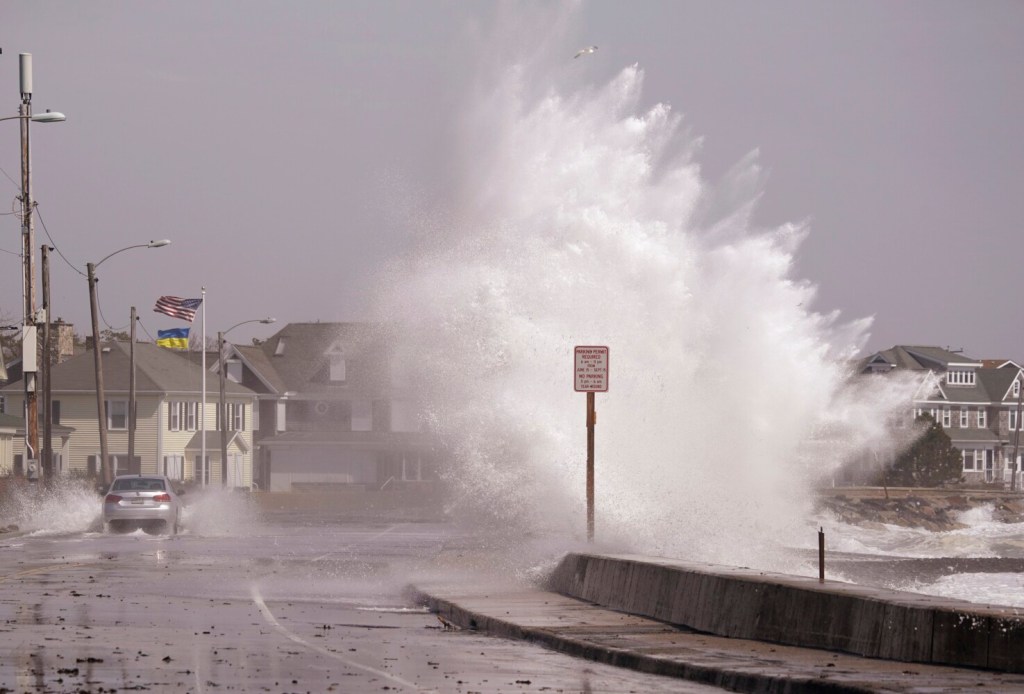 Waves break over the sea wall at Middle Beach in Kennebunk as a car drives along Beach Avenue during high tide on Tuesday, April 19, 2022. A spring storm caused coastal flooding and strong winds brought down trees causing power outages throughout the state. Gregory Rec/Staff Photographer