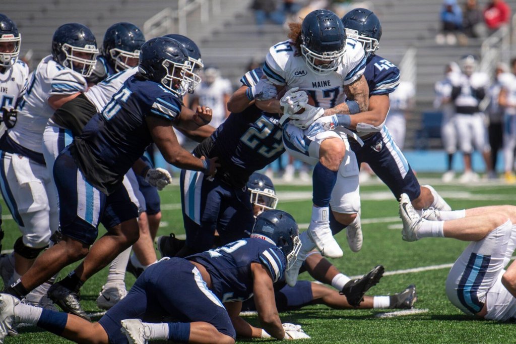 “Swarming to the ball is one of our biggest keys. It’s something we harp on, trying to get 11 hats to the ball,” said first-team nose tackle Raffaele Salamone, a Portland native and Deering High graduate. “I think from Day 1 to now, we made some big strides on defense – the defensive line, particularly.”