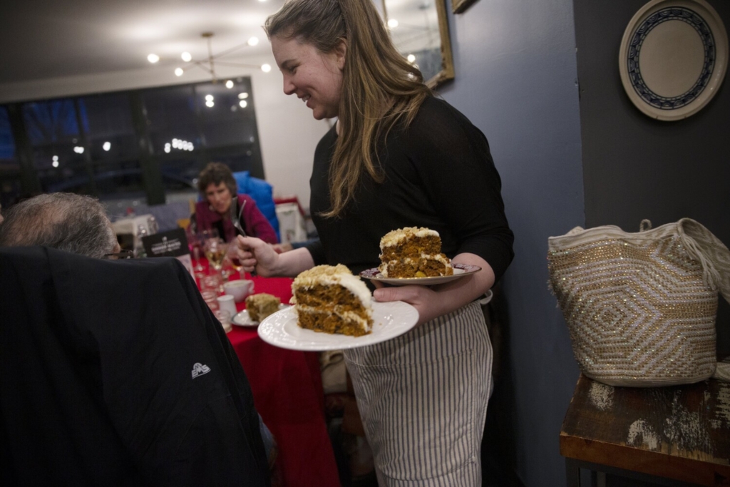 Corinna Stum serves carrot cake to Dinner Mates members during a gathering at her restaurant, Ruby’s West End. Derek Davis/Staff Photographer