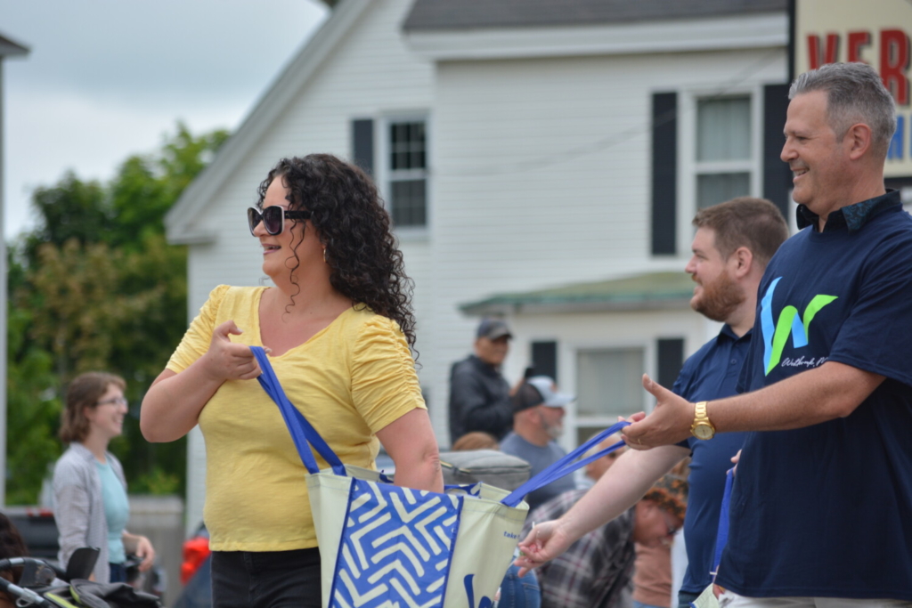 Westbrook City Council President Anna Turcotte, Councilor David Morse, center, and Planning Board John Turcotte toss candy to the crowd lining Main Street. Chance Viles / American Journal