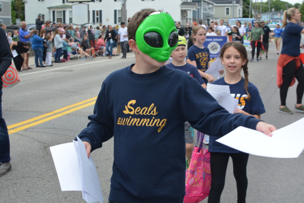 A masked member of the Westbrook Seals hands out pamphlets during the parade. Chance Viles / American Journal