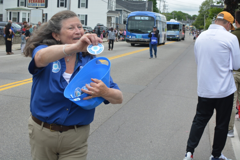 A Greater Portland Metro representative hands out stickers and candy before an electric Metro bus makes its parade appearance. Chance Viles / American Journal