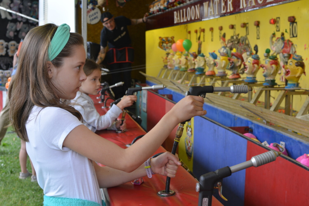 Sisters Taylor, left, and Abby Anderson of Westbrook, try their hands at carnival game. Chance Viles / American Journal