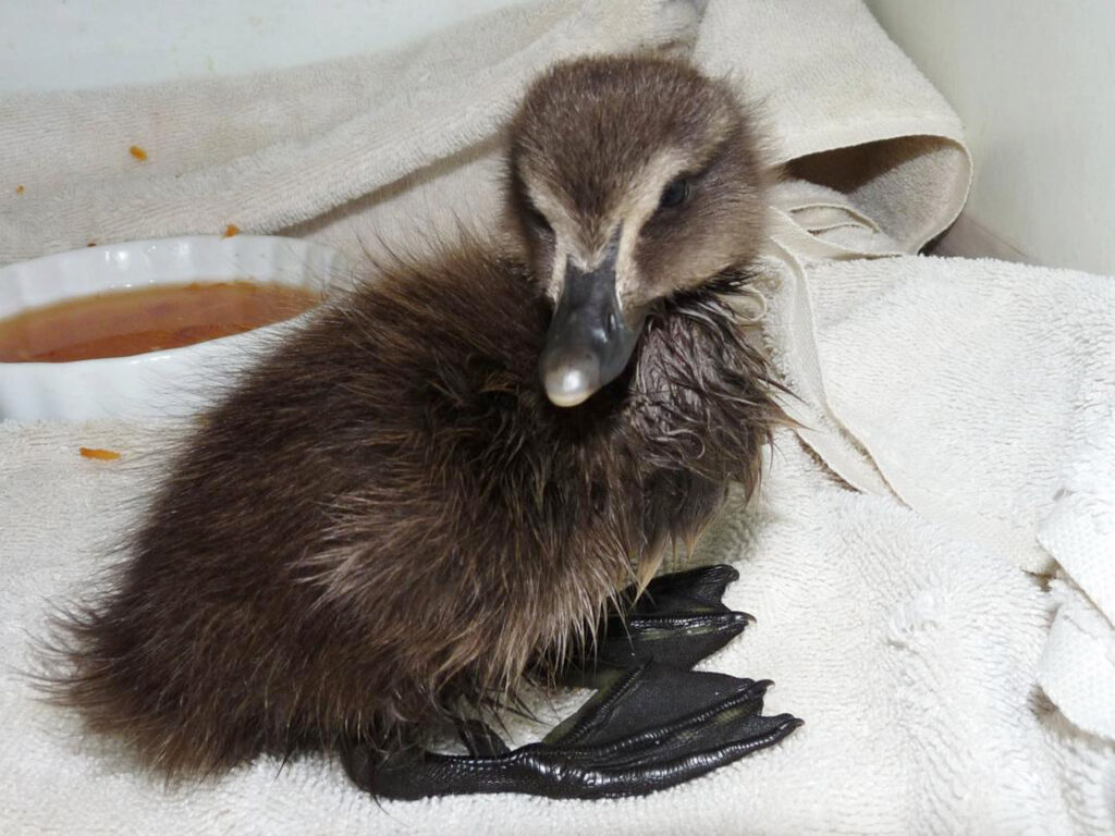 I was admittedly skeptical, but nonetheless, hopped in our rowboat and paddled out against the wind with a bucket in case she was right – and she was. There was a fuzzy little black chunk floating on the surface. Its bill was face down into the water.