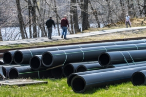 Pipes stored along the Kennebec River Rail Trail are seen in April 2021 behind the Greater Augusta Utilities District’s sewage treatment plant. The pipes were for a project to run new water and sewer pipes under the Kennebec River. Water and sewer projects are among those that can be funded by federal municipal relief grants. Joe Phelan/Kennebec Journal