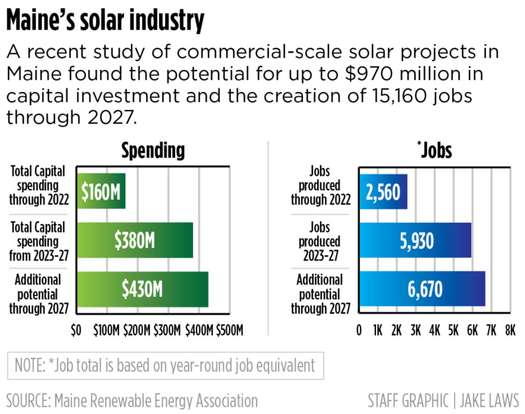 Maine’s fast-growing commercial-scale solar industry could spend $540 million and create 8,500 jobs by 2027 based on projects underway or in the planning stages, according to a new study.