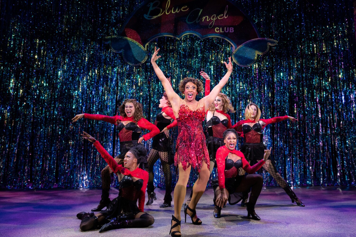 Jalen Michael Jones (left to right), Chad Takeda, Donovan Hoffer, Jonathan Bryant, Joshua Bellamy, Devin Price, and (center) Stephane Duret as Lola. Photo by Jared Morneau Photography.