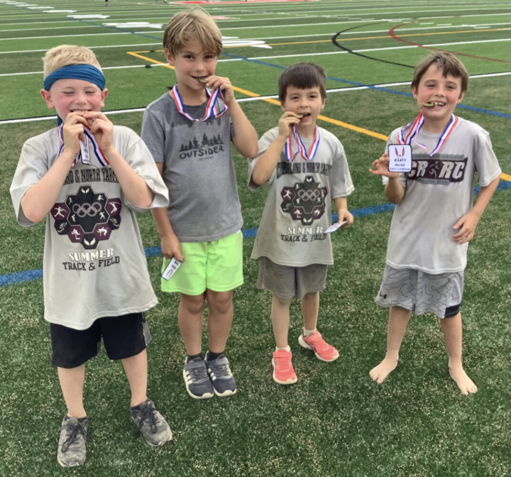Cumberland & North Yarmouth Summer Track & Field culminated its undefeated season with gold medals at the Summer Track and Field Maine State Championship for North Yarmouth’s boys 8 and under 4×100 relay. From left are Cooper Dissell, Toren Harris, Declan Booth and Liam Rideout. Individual state champions were won by Rowan Barry for the girls 15 800 meter; Tait Harvey for both the boys 15 800 and 1500 meters; Jackson Walton for the boys 11-12 200 meter; and Tori Zandan for the Girls 13-14 100 meter hurdles. Contributed / John Lane