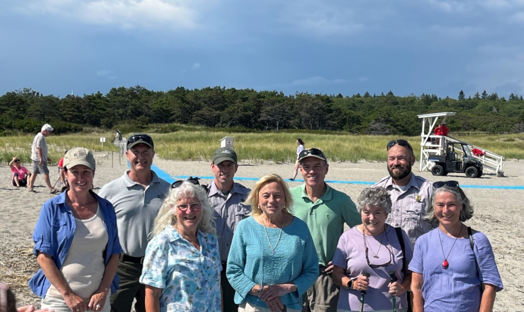 From left: Amanda Beal, commissioner of the Maine Department of Agriculture, Conservation and Forestry; Gary Best, Southern Region State Park manager; Rep. Allison Hepler; park manager Sean Vaillancourt; Gov. Janet Mills; Andy Cutko, director of Bureau of Parks and Land; Deborah Stockwell; Matt McGuire, assistant Southern Regional Parks manager; and Sen. Eloise Vitelli. All stand on the new mobility access pathway at Popham Beach. Maria Skillings / The Times Record