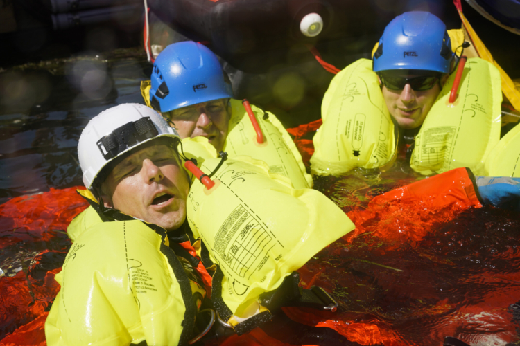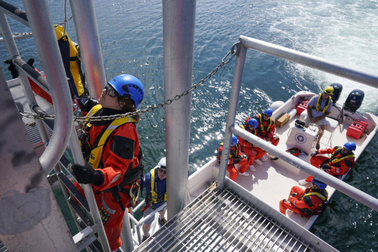 The students step off the pier into the chilly bay waters to learn how to safely abandon a vessel or the turbine in an emergency. They inflate a life raft, climb in, and right it when it’s upside down.