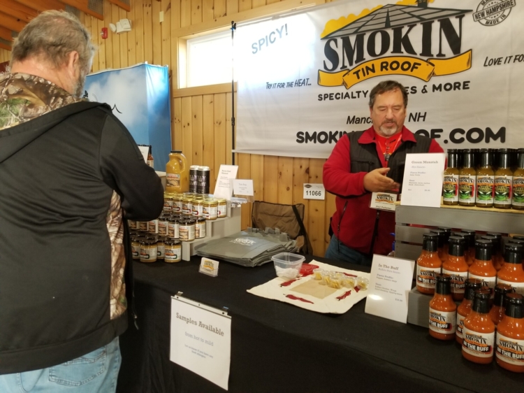 Phil Pelletier, owner of Smokin’ Tin Roof in Manchester, New Hampshire, describes the flavored sauces available for sampling Sunday at the Fryeburg Fair. Smokin’ Tin Roof offers a variety of mustards and specialty sauces. Vanessa Paolella/Sun Journal