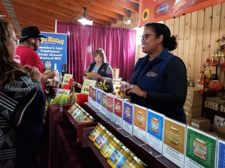 Natasha Dana, an employee of Raye’s Mustard in Eastport, describes the process for making the beer-infused mustards Sunday to visitors at the Fryeburg Fair. Raye’s has nine beer-infused mustards created in collaboration with Maine and Massachusetts breweries. Vanessa Paolella/Sun Journal
