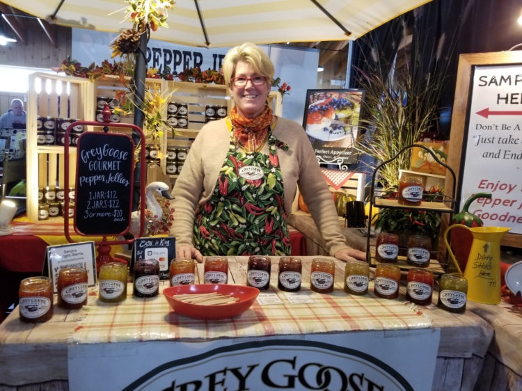 Sandra Dwight-Barris, owner of Grey Goose Gourmet Pepper Jellies in Wayne, displays jars of a dozen variations of her mother’s original pepper jelly recipe Sunday at the Fryeburg Fair. Vanessa Paolella/Sun Journal