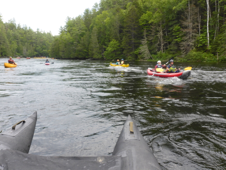 A group of paddlers move ahead of rafts on the Kennebec River.