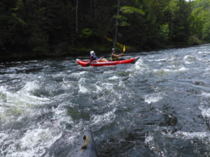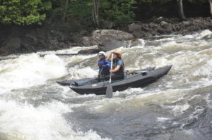 Our enthusiastic group paddled an assortment of boats. Ten Chowderheads navigated three solo kayaks, a solo canoe, a tandem canoe, a tandem inflatable kayak, and Nancy and I were in a shredder. Nancy’s shredder is a two-person inflatable boat propelled by single blade paddles. Several years had elapsed since we last shared a shredder, so we expected to be challenged, especially by the large waves in Big Black Brook Rapid.